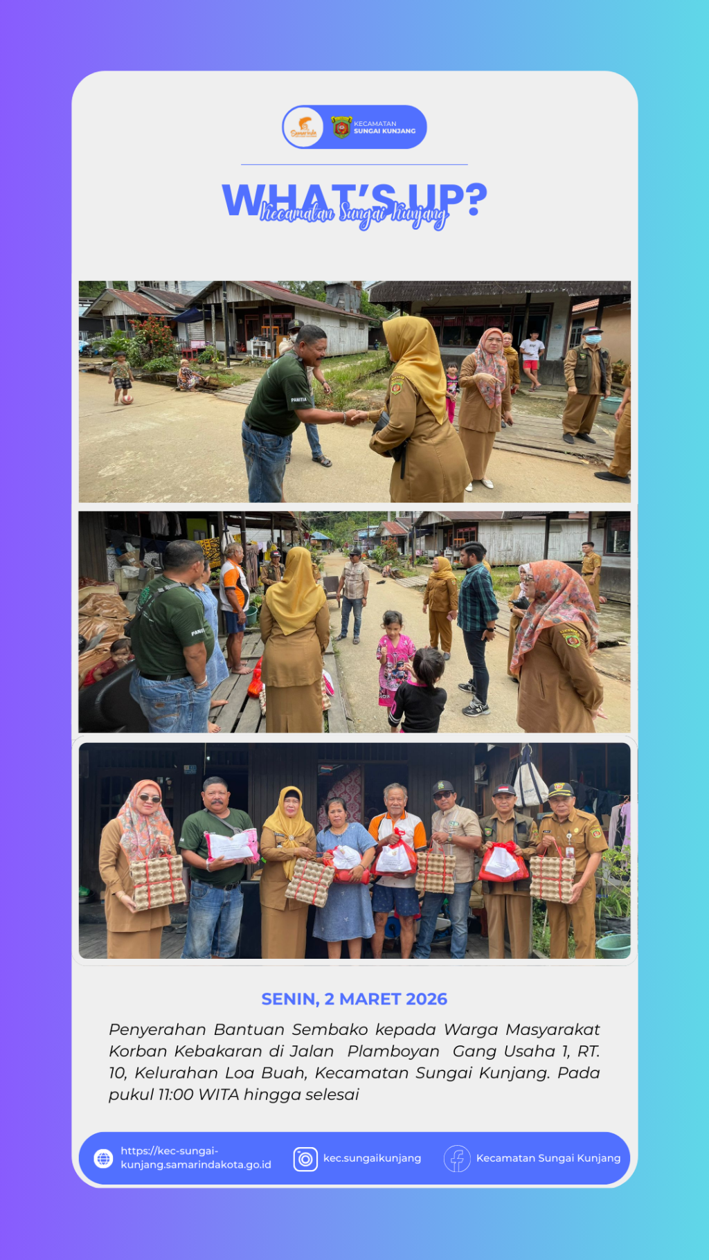 Senin, 2 Maret 2026 - Penyerahan Bantuan Sembako kepada Warga Masyarakat Korban Kebakaran di Jalan Plamboyan Gang Usaha 1, RT. 10, Kelurahan Loa Buah, Kecamatan Sungai Kunjang. Pada pukul 11:00 WITA hingga selesai